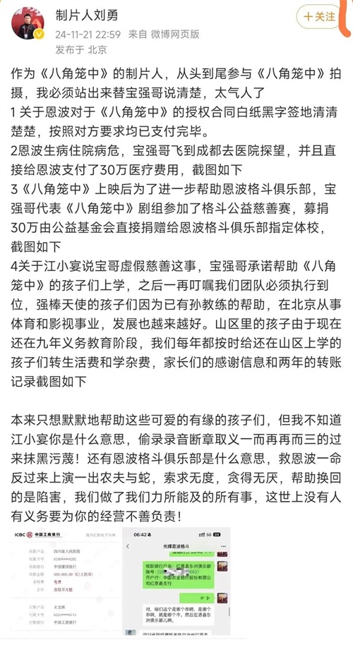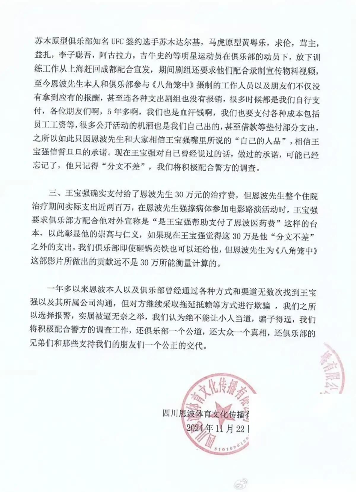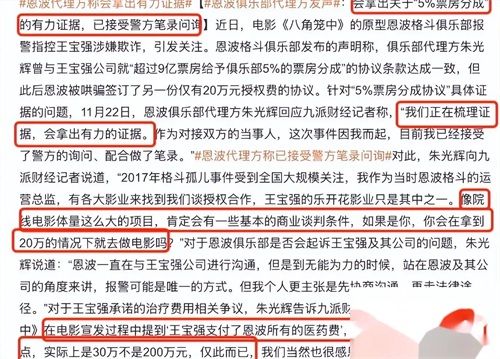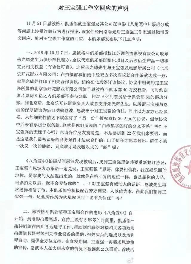 随着王宝强方面对其指控进行辟谣后,事情也愈演愈烈。11月25日,双方的纠纷升级,恩波格斗俱乐部向媒体提供了聊天记录和合同草案,声称王宝强曾答应分给他们5%的票房。