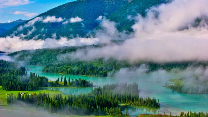 从路口直行约40公里就到了喀纳斯湖景区,这里是整个景区的核心部分。顺势而下的布尔津河在这里形成了很多漫滩,景色优美。喀纳斯湖是一个长20多公里宽约2公里的狭长的高山淤积湖。发源于中、俄边境友谊峰冰川的雪水汇集而下,在这里淤积成湖而后又顺流而下,注入额尔齐斯河最后流出国境注入北冰洋。湖水最深处有188米,最近传说的湖怪现象给这里增添了神秘色彩。在这里可以乘坐游艇顺湖而上,领略两旁快速掠过的视觉盛宴,还可以登顶附近山峰上的观鱼亭,一觅喀纳斯湖的全貌和远处友谊峰的身影。