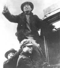 黄敬同志扶着电车向群众讲话,下为宋黎同志