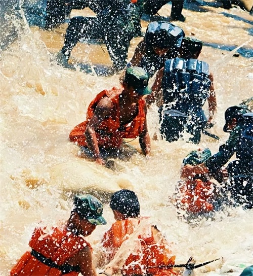 就这样,战士们一次又一次地重装上阵。几个轮回后,他们的腿被泡得发肿。洪水里尖锐的石头划破了他们的皮肤,血肉外翻,愣是没有吭半点声。