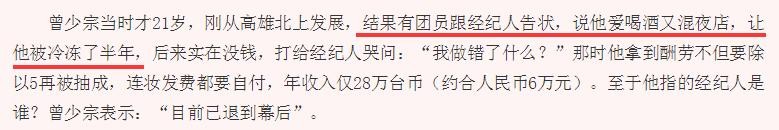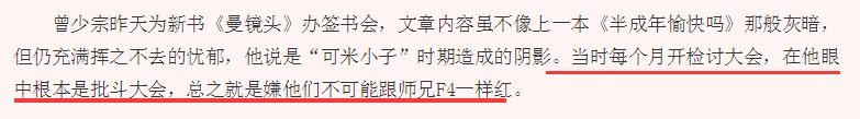 而曾少宗更是把“可米小子”的经历称之为噩梦,因为他们组合不火,经纪人就故意欺负他们,还把打歌服扔到地上叫他捡,每个月还会开批斗大会,嫌他们没有F4那么红,而且他单独接广告,成员们也会酸他,还有成员向经纪人告状,说他爱喝酒,还混夜店,导致他被冷藏了半年。