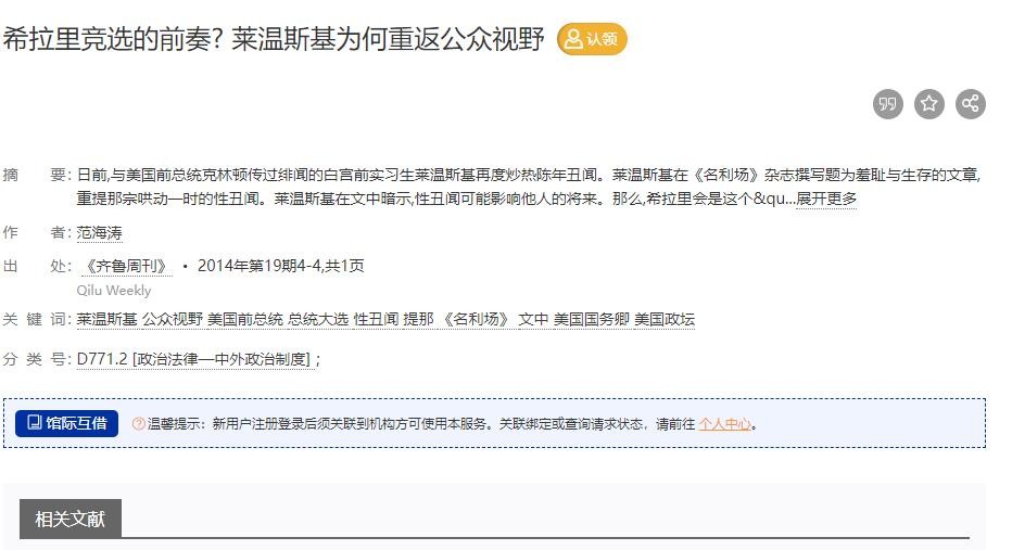 参考资料:[1]范海涛.希拉里竞选的前奏? 莱温斯基为何重返公众视野[J].齐鲁周刊,2014,0(19):4-4