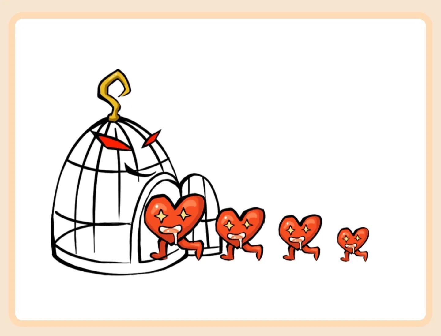 图中是一个大大的笼子,笼子口打开了,一颗颗红心正流着口水往笼子里面走去。