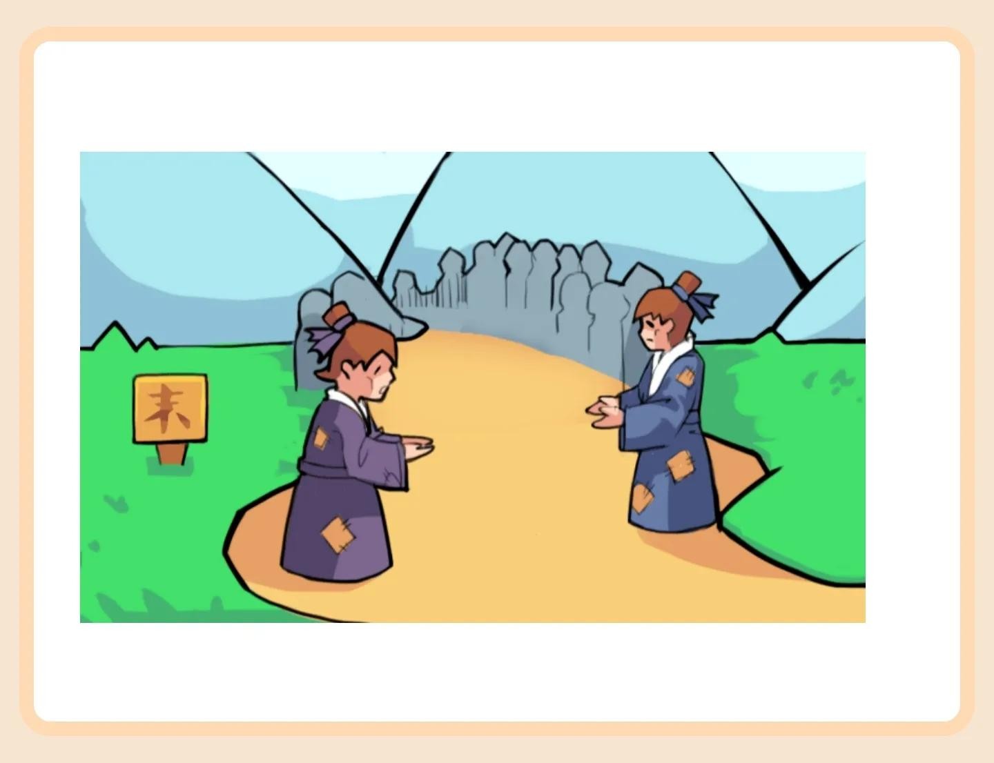 一条黄色的大路上站着两个古代男子,他们的衣服上都打着补丁,还都摊着双手一副不知所措的样子。旁边竖着一块木牌,木牌上有一个“末”字。