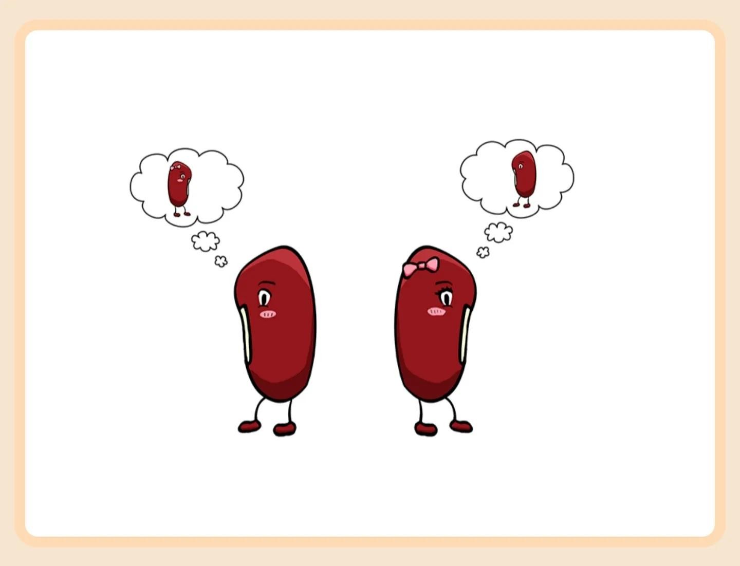 图中有两颗巨大的红豆,右边那颗还别着一个粉色的蝴蝶结。它们竟然都长着双腿,脑子里还分别想象着另外一颗红豆。