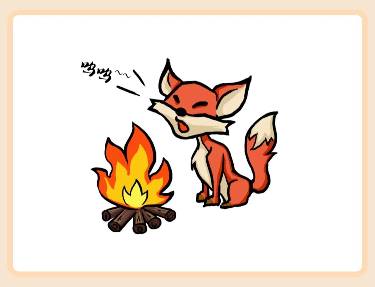 熊熊燃烧着的火堆旁坐着一只大狐狸,它正在呜呜地叫着。