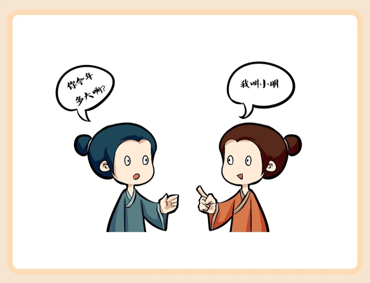 图中有两个古代女子,左边那个问:“你今年多大啊?”。右边那个回答:“我叫小明”。