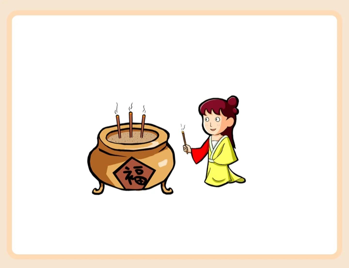 一个巨大的香炉里插着三根香,旁边跪着一个古代女子,她有一只衣袖竟然是红色的,红色衣袖的那只手拿着一根点燃了的香,正准备插到香炉里去。