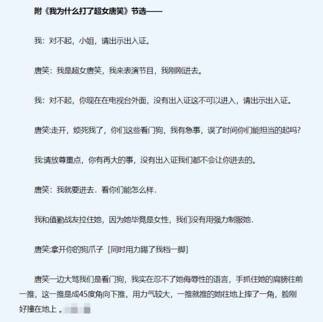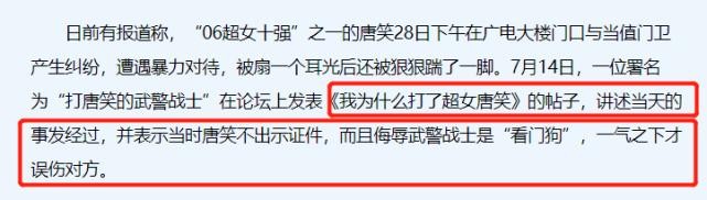 在此事被媒体曝光后不久,有网友自称是打唐笑的武警,还在论坛发了一篇“我为什么打了超女唐笑”的文章,绘声绘色描述了事情经过,甚至在文中称“没有击毙她已经是最大的照顾”。也因为此事,唐笑被网友一直攻击到现在,认为她行为不端,且人品有问题。
