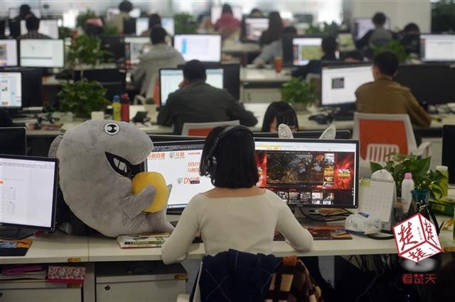 而今在斗鱼公司位于光谷软件园的总部,几乎每层楼前台,都放置了一个鱼缸,里面养的就是“斗鱼”。办公区里跟斗鱼相关的形象无处不在:墙上是斗鱼形象的手绘图,会议室取名为鱼塘客厅,企业团建中的爱好圈子、培训活动分别取名兴趣鱼塘、斗鱼学堂。连鼓励个人和团队创新争先的一系列奖励,都带“鱼味”,比如金鳞奖。