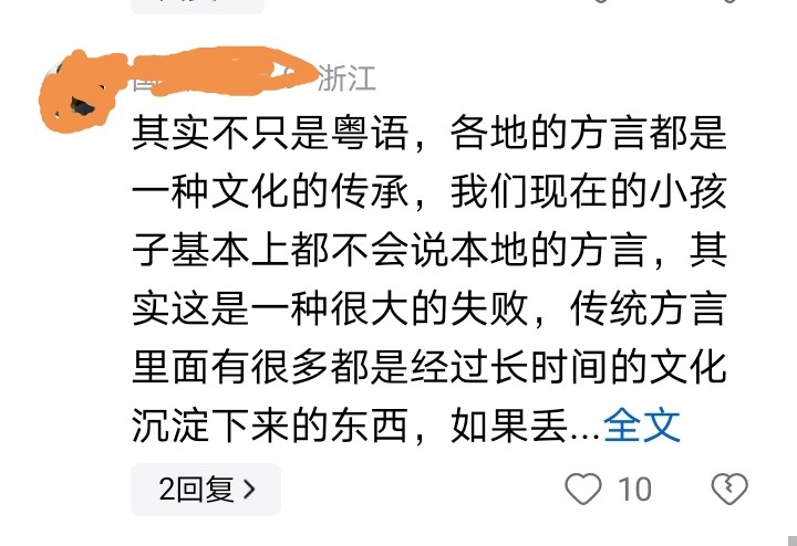 一位浙江的网友感叹说:“其实不只是粤语,各地的方言都是一种文化的传承,我们现在的小孩子基本上都不会说自己的本地方言了,其实这是一种很大的失败,传统方言里面有很多都是经过长时间的文化沉淀下来的东西,如果丢失的话,会很可惜的,一定要有要有人传承起来。”