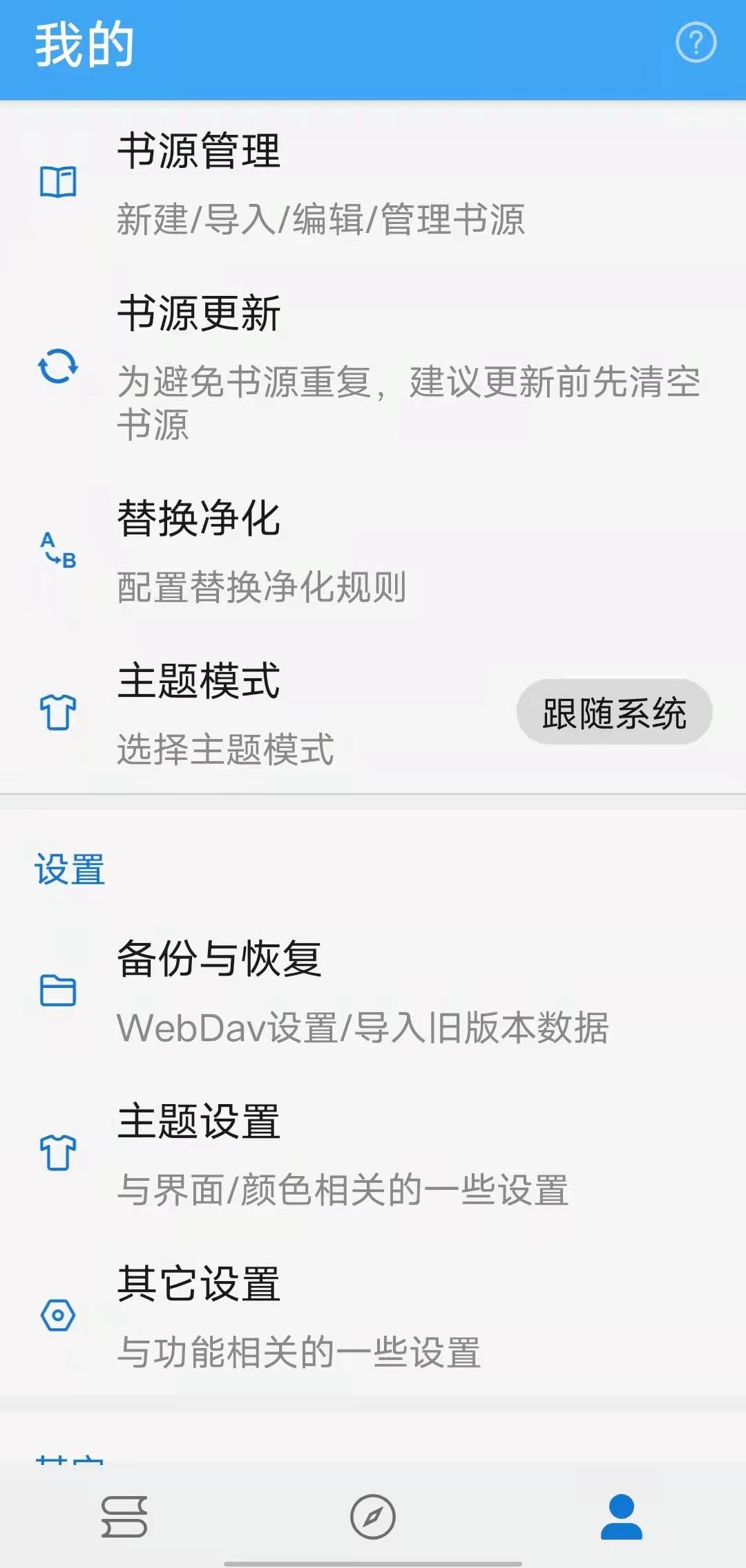 软件还有在线换源、离线缓存、听书、自动翻页、数据备份与恢复等实用功能。
