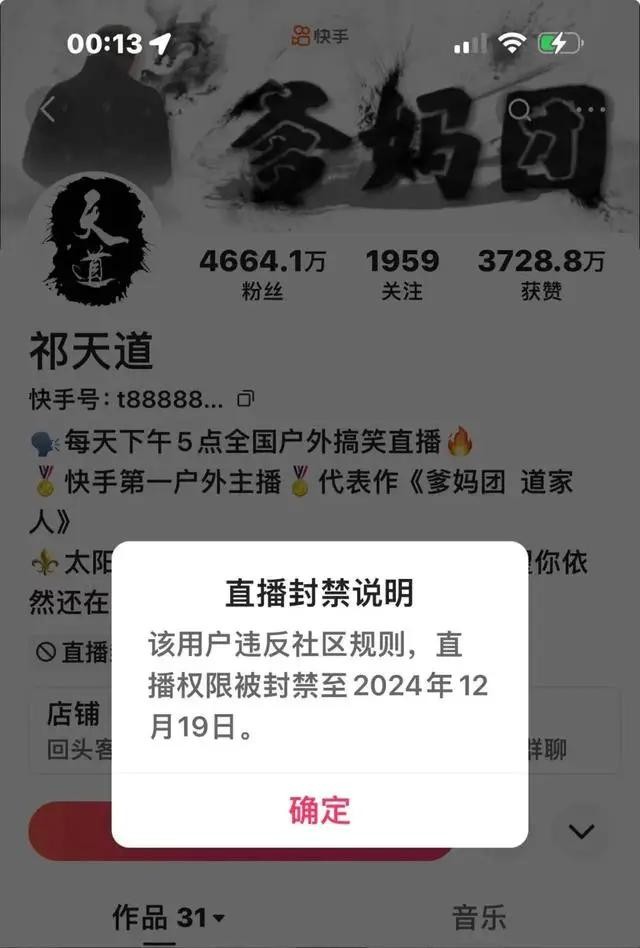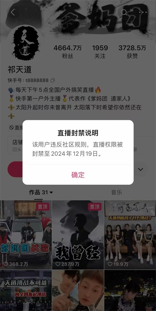 在 2024 年 12 月 4 日下午,祁天道的直播账号因严重违反社区规则被封禁至 12 月 19 日。然而这一举措并未平息众怒,网友们纷纷表示对封禁时间的不满,认为如此处罚实在是太过轻微,难以起到真正的警示作用。