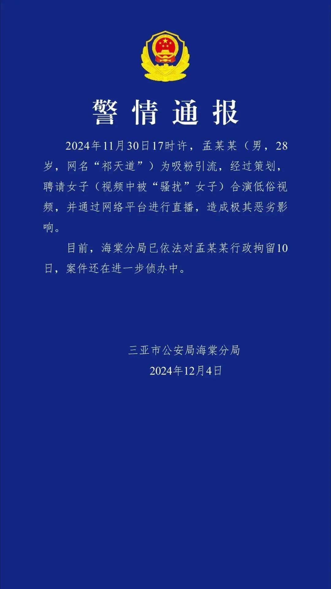 这种毫无底线的操作,瞬间引发了社会各界的广泛关注。随着事件的发酵,三亚市公安局海棠分局在 2024 年 12 月 4 日发布通报,明确指出祁天道为了吸粉引流而精心策划低俗视频的恶劣事实。