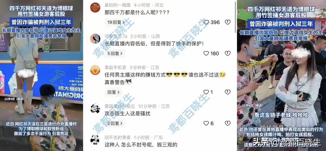 4500万粉主播祁天道直播捅女生屁股!被封15天,低俗内容全网怒火