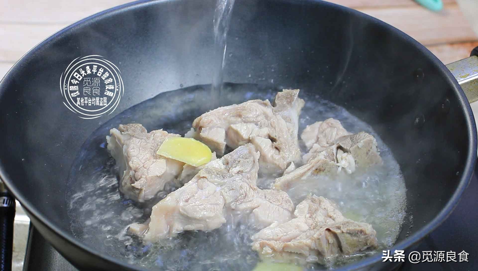 3、清水锅中,放入大半锅凉水,放入清洗干净的猪脊骨,放入少许的姜片,大火煮沸后转小火多煮2分钟的样子,打去浮沫后捞出排骨,沥干水分;