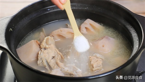 8、时间到了,莲藕粉糯之后,放入少许的食盐、胡椒粉调味;