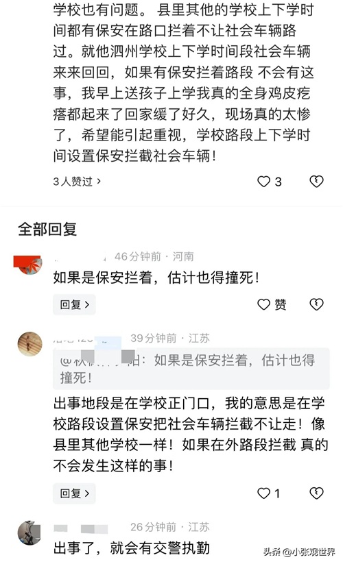 学校也有问题。 县里其他的学校上下学时间都有保安在路口拦着不让社会车辆路过。就他泗州学校上下学时间段社会车辆来来回回,如果有保安拦着路段 不会有这事,我早上送孩子上学我真的全身鸡皮疙瘩都起来了回家缓了好久,现场真的太惨了,希望能引起重视,学校路段上下学时间设置保安拦截社会车辆!