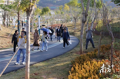 山多地少的信宜,以粤西首个县域城市设计为蓝图,在玉都新区打造6个生态公园,实现百姓“推窗见绿、出门即公园”的愿景。玉都新区山水公园,是媒体代表们采风的首站。公园里山水相依,偶有鸟儿掠过湖面,激起层层涟漪。媒体代表们边走边拍,不时称赞信宜“好山好水好地方”。