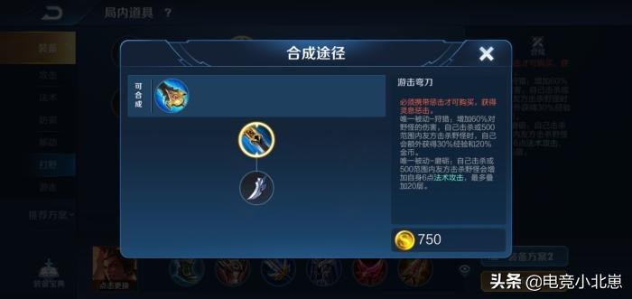 <分析>这种打野刀我们也叫做是蓝刀或者法刀,正常情况下是用于法刺打野的时候使用,典型的代表有露娜和司马懿;二级打野刀在叠满被动20层之后就可以增加120点的法术强度,性价比非常高;