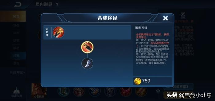 <分析>这种打野刀我们通常叫做红刀,一般情况下的刺客打野最常用的打野刀就是这一件,典型的代表有韩信,李白,孙悟空。基于击杀野怪被动增加物理攻击和冷却的缘由,刺客出这件打野刀是最合适不过的。