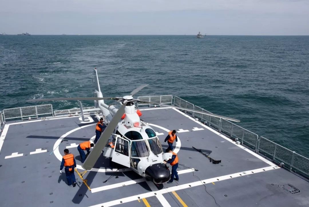 4月26日,一架参加演习的直升机在中国海军盐城舰上做起飞准备。