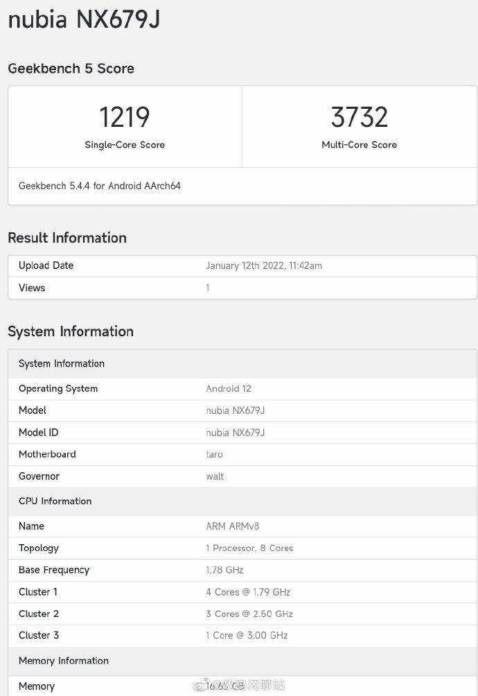 1 月 12 日消息,今日在 GeekBench 5 上公布了努比亚新款红魔游戏手机 7 的跑分,型号为 NX679J,这款手机将搭载全新一代骁龙 8 处理器,单核跑分 1219 分,多核跑分 3732 分。