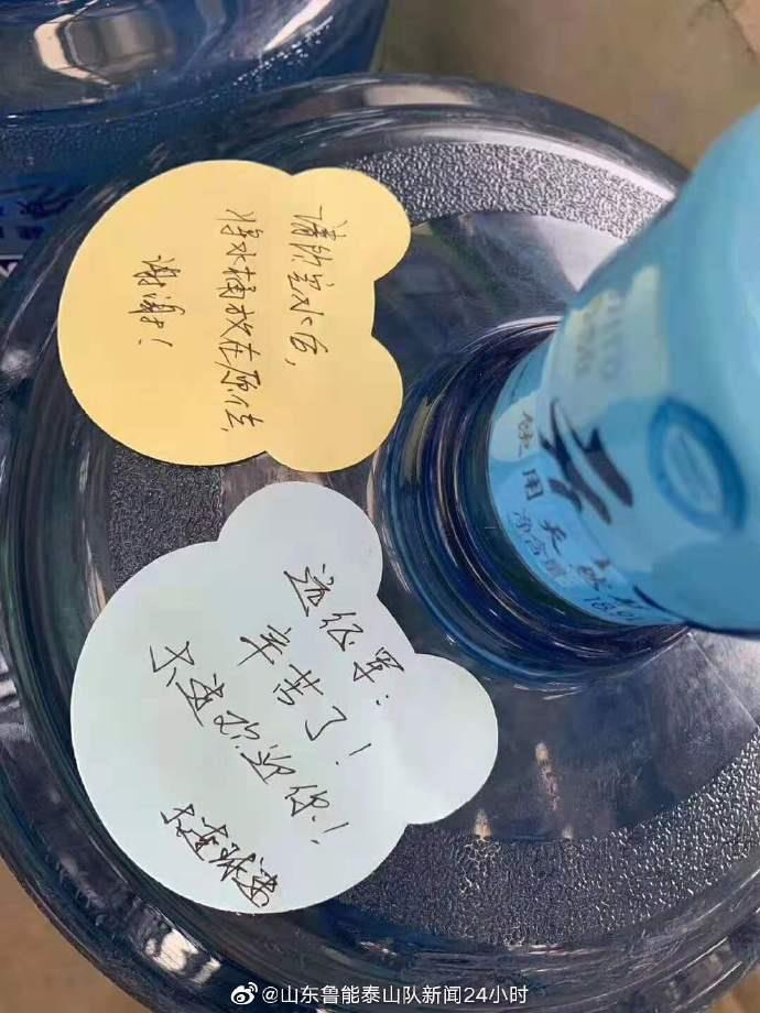 从微博博主“山东鲁能泰山队新闻24小时”发布的图片中可以看到,一方球迷在桶装水上的便利贴中写道:远征军辛苦了,大连欢迎你。