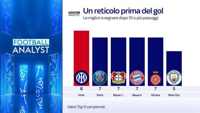 来自意大利天空体育的统计指出,本赛季至今,国米在意甲联赛中连续传球至少 10 次后的进球多达 8 球,在这项技术统计上他们排在同期欧洲五大联赛所有球队的第一位。巴黎、勒沃库森、拜仁以及赫罗纳同为 7 球并列第二,曼城 5 球位列第六,而米兰在这项统计上的进球数为 0,排名垫底。