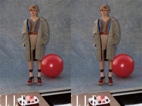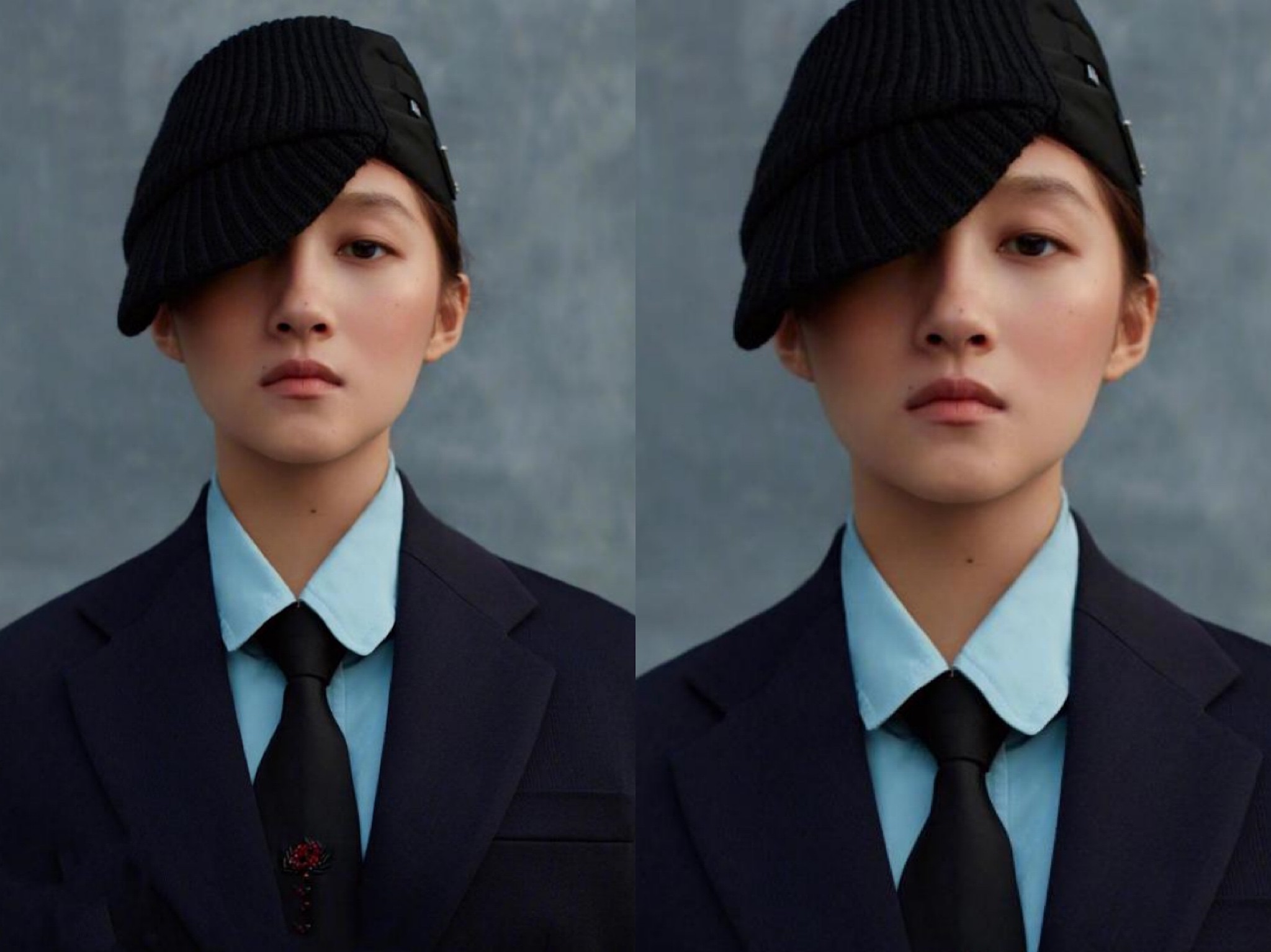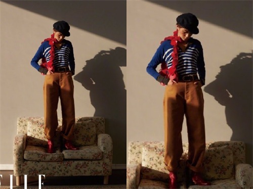 关晓彤身穿温柔的蓝白拼色V领针织背心,搭配浅色的唇妆,面对镜头露出犀利的眼神。温柔的衣着却搭配一顶略显酷炫的黑色针织拼接帽子,帅气十足。从这组造型来看,关晓彤的确是展示了与众不同的一面。