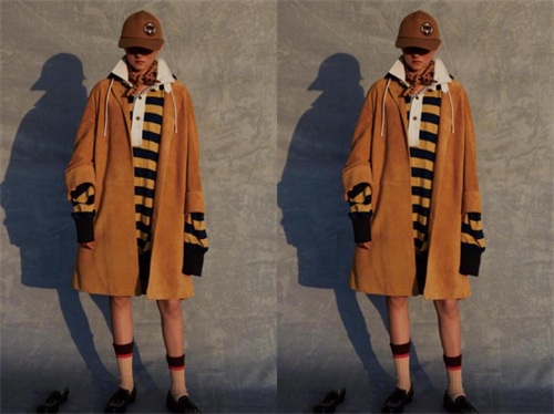 黑黄两色的宽条纹POLO衫外搭一件土黄色的连帽外套,再戴上一顶同色的棒球帽,同色系的搭配显得充满生命力。黑黄撞色的长袜搭配黑色平底鞋,学院风十足,这样的她,像极了90年代的大学生模样。