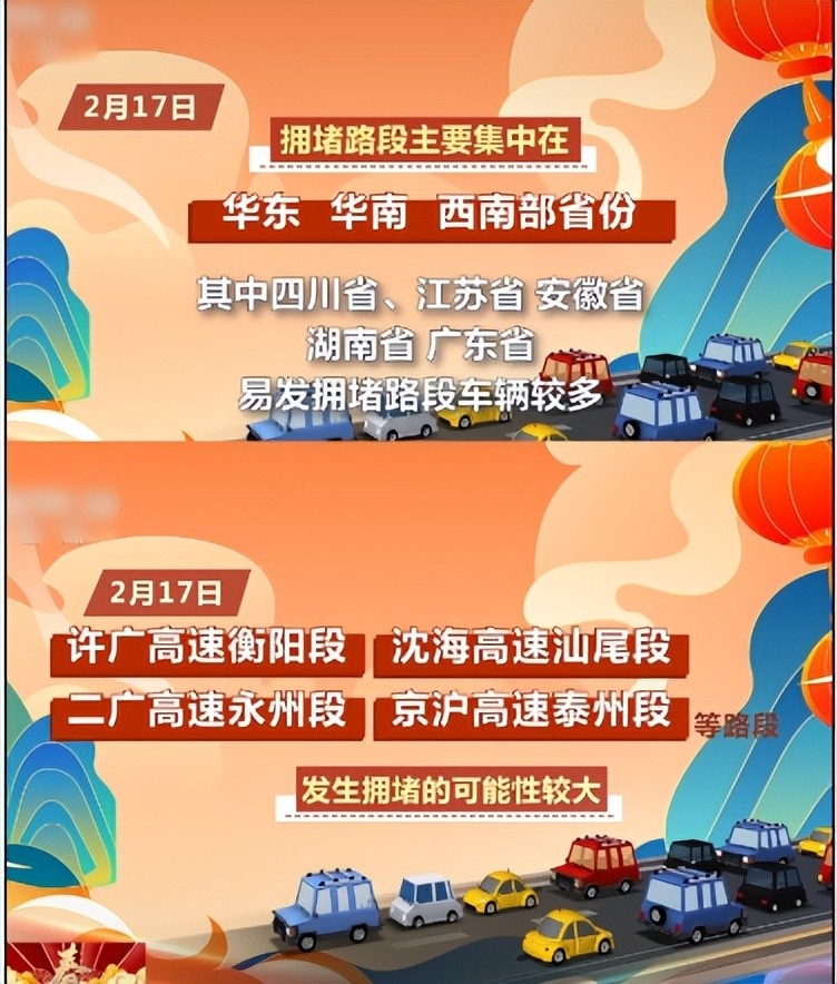 2月17日,许广高速衡阳段沈海高速汕尾段,高速永州段京沪高速泰州段等发生拥堵的可能性较大