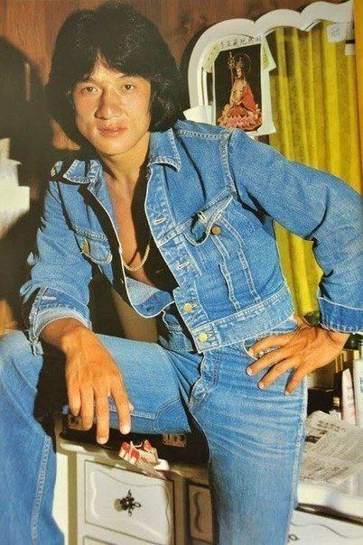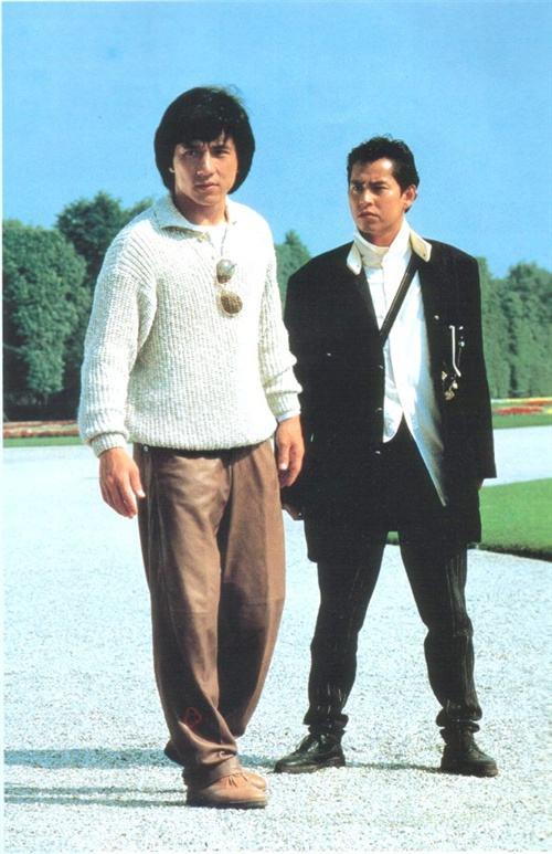 很明显的单眼皮的成龙,穿着这个白色的衣服,很搞笑。