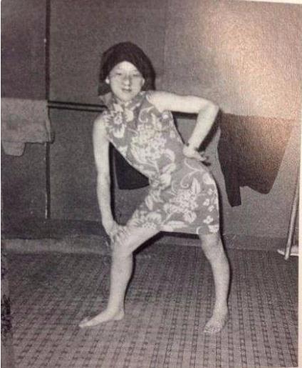 成龙1960年在香港,穿着女装的成龙,大鼻头特别显眼。