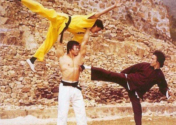 这张剧照里,李小龙抓着成龙的头发,成龙配合的露出痛苦的表情。
