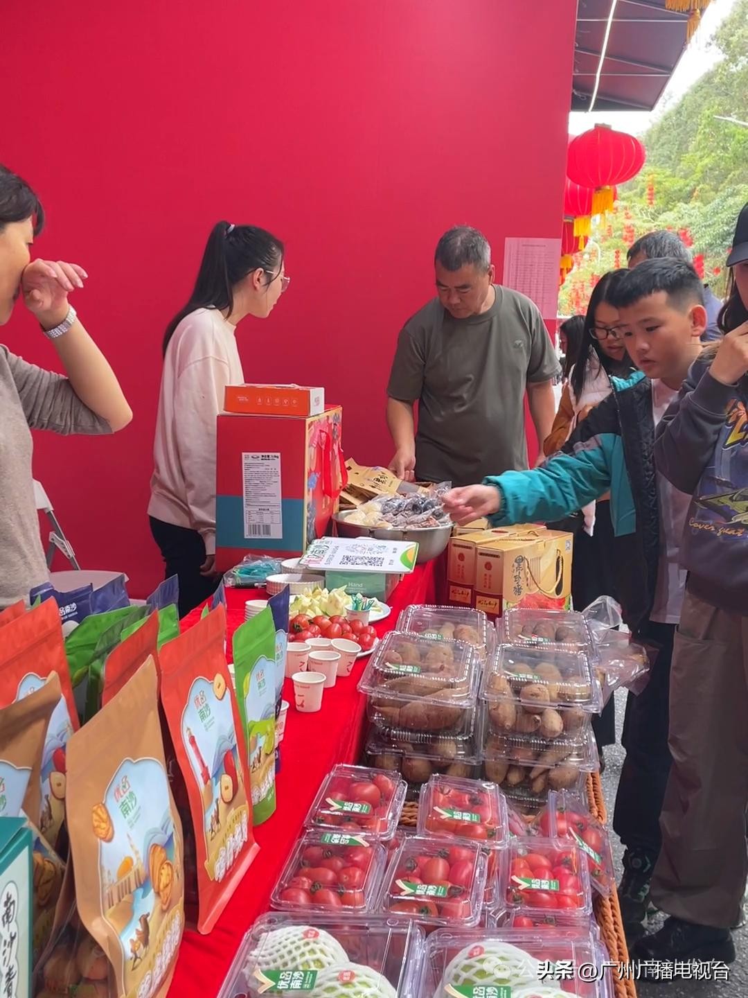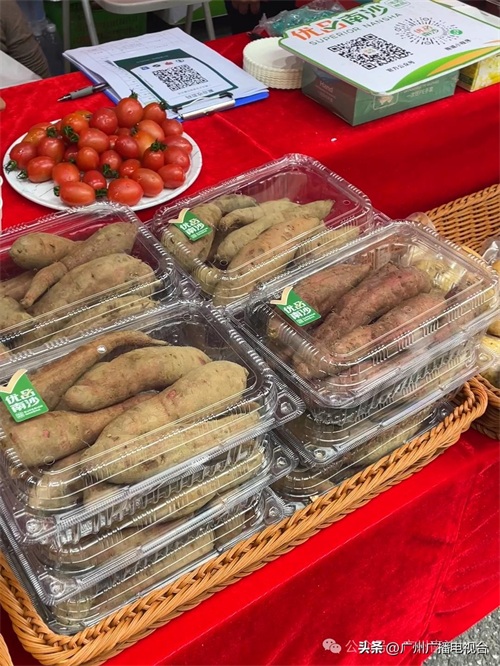 现场摊位设有非遗水乡婚礼、景泰蓝掐丝珐琅画、香云纱、广彩瓷烧技艺等非遗文化体验,有南沙一点红番薯、新垦莲藕、宝石鲈、葵花鸡、黑珍珠腊味、红宝石番石榴等南沙各地的特色农产品展示,逛吃逛吃,十分热闹。