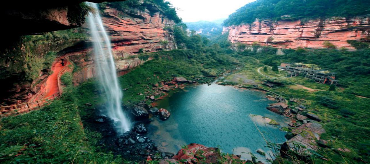 瀑布周围森林植被环绕丹霞画壁,整体轮廓醋似心形,是全球最大的自然形成的瀑布类心形丹霞景观,被誉为“天下第一心”。