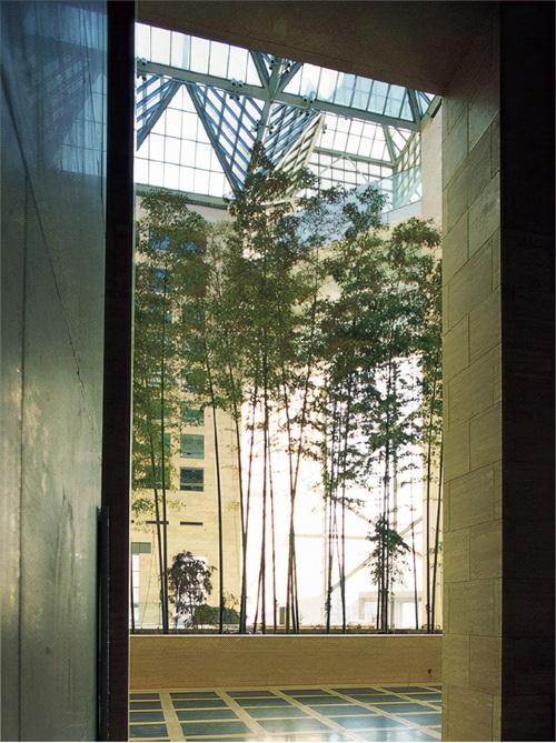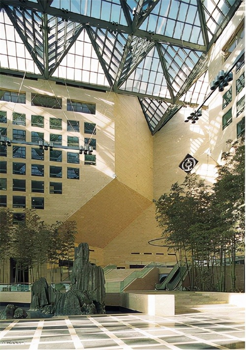 在尺度上的问题,二十多米高的竹子与五米左右的大石用的恰到好处。在这个空间内处理银行的对外业务,会给整个大厦带来人气,不至于是偌大的中庭显得空旷。再就是阶梯状的空间设计可以满足银行的各种营业需求。另外,室内外的过度流露出一丝和谐,建筑外墙与室内墙面的建材都是米黄色的石材,这种颜色的处理化解了内与外的差别,使空间过度的很自然。在景观方面,运用景窗与不多的竹石,在恰当的地方造了恰当的景,起了恰当的作用。