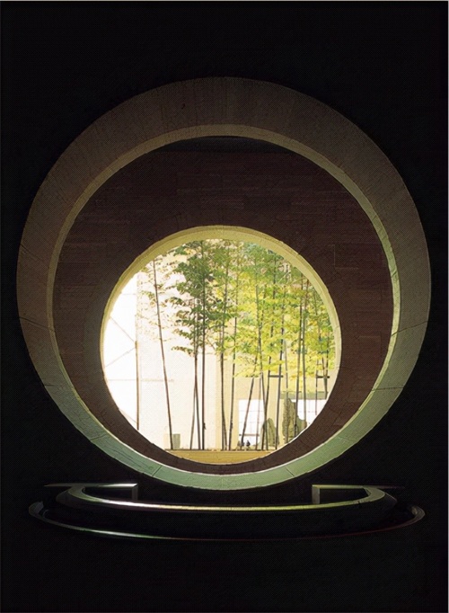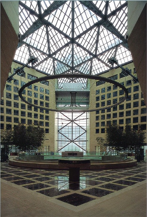 由玻璃屋顶洒下的天光,园洞形大门,不仅解决列问题更是充满了东方韵味。巨大的园林空间,通过层顶玻璃天窗和一面垂直透明的玻璃幕墙与室外联系,加之两侧玻璃大门的衬托,整个建筑显得晶莹剔透。大厅内部,西北两侧高墙上的8个巨大切面,使空间效果得到明显改善,而且还体现了银行的实力和应有的威严,不会因为中式园林的设置而显得过于秀气。切面之间悬挂着一个钢制大圆环,起到与切面缓和的作用。大厅内部墙壁有4个大圆孔,保证了西北两个方向上的视觉延伸。由东南角的主入口进去,正好与切面组成的几何构造内部空间遥相呼应。中银总部大厦的空间特点除了内部的中庭外,再就是他的入口了。
