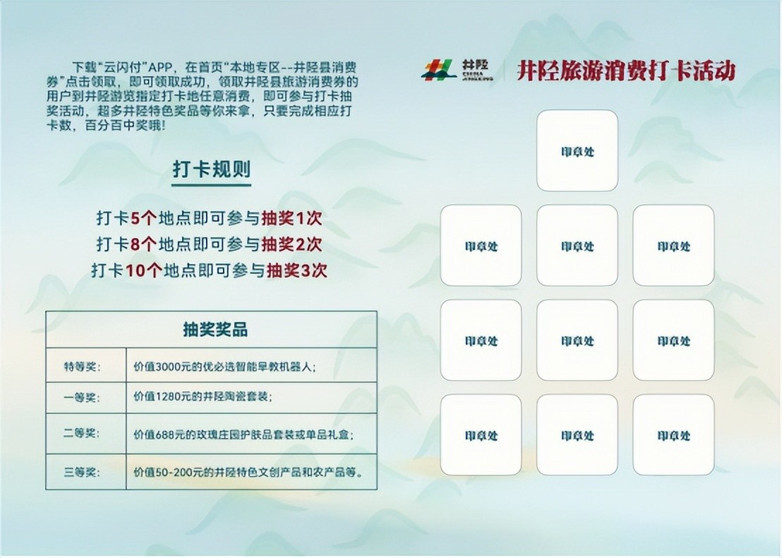 除享受旅游消费优惠外,领取文旅消费券的用户,到井陉游览指定打卡地,并任意消费,即可参与打卡抽奖活动(可在指定打卡地领取打卡护照),超多井陉特色奖品等你来拿,只要完成相应打卡数,百分百中奖哦!