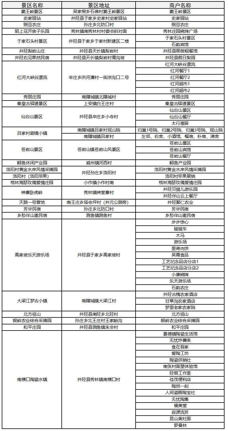 备注:窑洞山庄、芳华民宿、天路一号营地、北方祖山参与8月下旬的第二期井陉旅游惠民消费券活动。