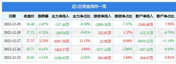 12月29日的资金流向数据方面,主力资金净流出157.44万元,占总成交额0.58%,游资资金净流出2009.36万元,占总成交额7.37%,散户资金净流入2166.8万元,占总成交额7.95%。