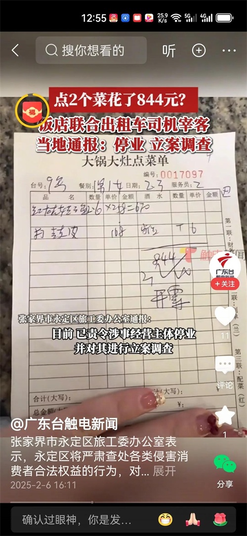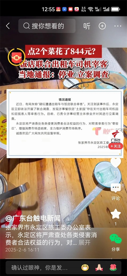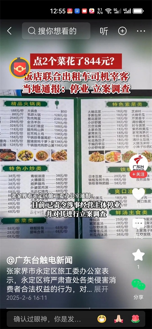 好在张家界市永定区旅工委办公室迅速行动起来,在2月6日就此事发布了情况通报。经调查,涉事的“土家园”餐饮店存在支付出租车司机回扣招揽客人等宰客行为。目前,相关部门已责令涉事经营主体停业,并对其进行立案调查。这一举措,无疑给广大游客吃了一颗定心丸,也彰显了当地政府整治旅游市场乱象的决心。