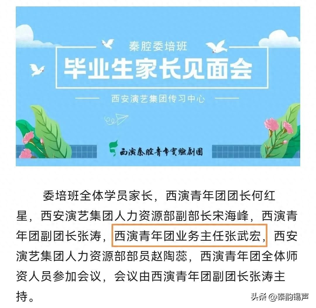 西安演艺集团青年团官方微信公众号“西演秦腔青年团”发布消息,2023年2月25日,西安演艺集团传习中心毕业生家长见面会在曲江演艺大厦隆重举行,西演青年团团长何红星、副团长张涛、业务主任张武宏等出席。