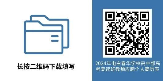 长按识别下方二维码下载2024年电白春华学校高中部高考复读班招聘教师个人简历表,将填写完整的2024年电白春华学校高中部高考复读班招聘教师个人简历表、学信网学历认证报告、职称证、身份证、毕业证、教师资格证、普通话等级证、荣誉证书等相关证件的扫描件压缩成文件夹(文件夹标题为“高考复读班+学科+姓名+毕业院校” ,如:高考复读班+语文+李蕾+广西师大),发送到学校招聘邮箱:chzpjs@163.com。