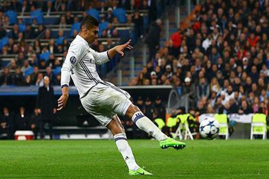 在大力抽射的时候还有一个小技巧要大家注意的,那就是身体尽可能不要后仰。每当我大力抽插的时候,都比较习惯往前面轻轻的压一下身体。身体微微地前倾,也能够防止我把球给踢高了。有的时候距离比较远的情况下,我建议大家不妨试一试这种射门方式,往往会有着意想不到的效果。