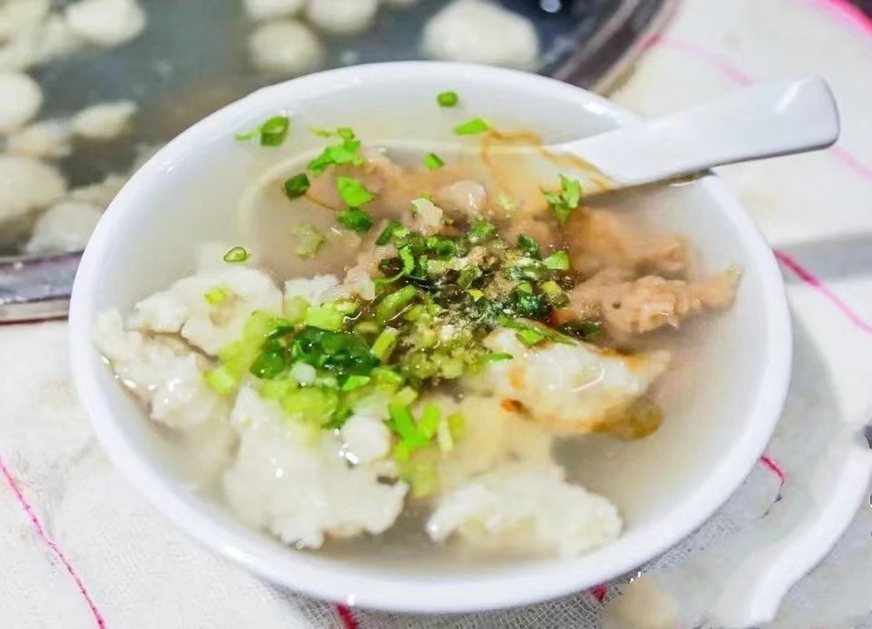 一入口便能清晰的感觉到高汤的鲜、花生碎的酥、甜辣酱的微辣以及芋圆外皮的韧劲和内馅的鲜嫩多汁,这些丰富的口感结合在一起直击你的味蕾,这时再配上丸子汤那就更完美了!