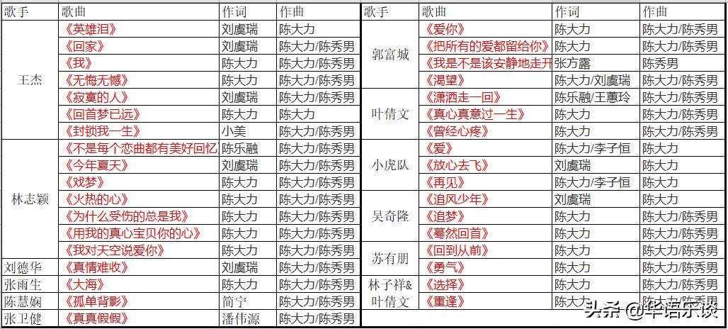 以上只是陈大力与陈秀男创作的小部分作品,他们脍炙人口的金曲有数百首之多,捧红了包括上述歌手,还有刘德华、小虎队、伊能静等众多飞碟歌手。