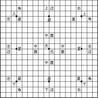 在棋盘上标有9个小圆点,称作“星”。中央的星又称“天元”。