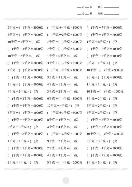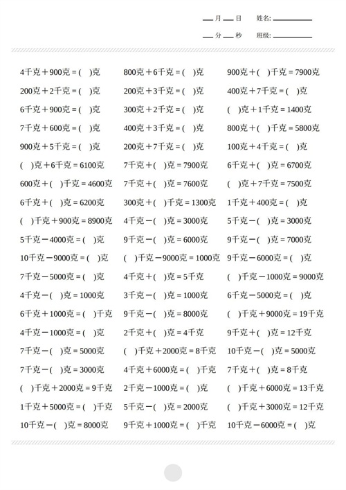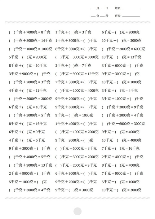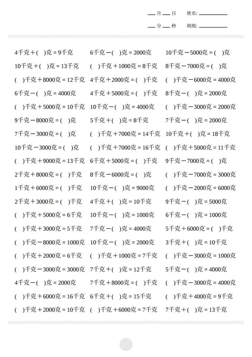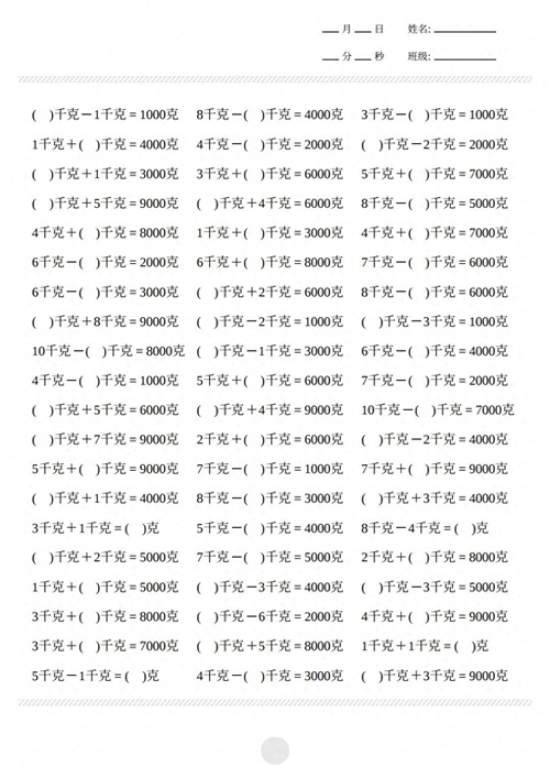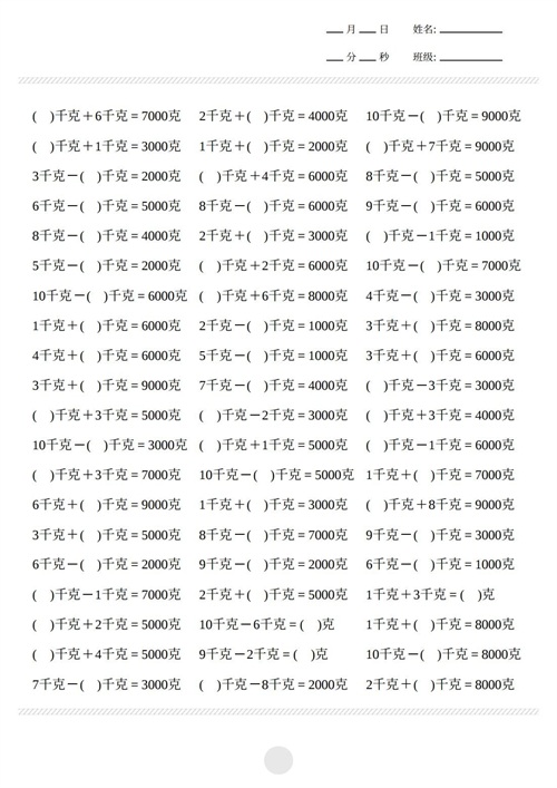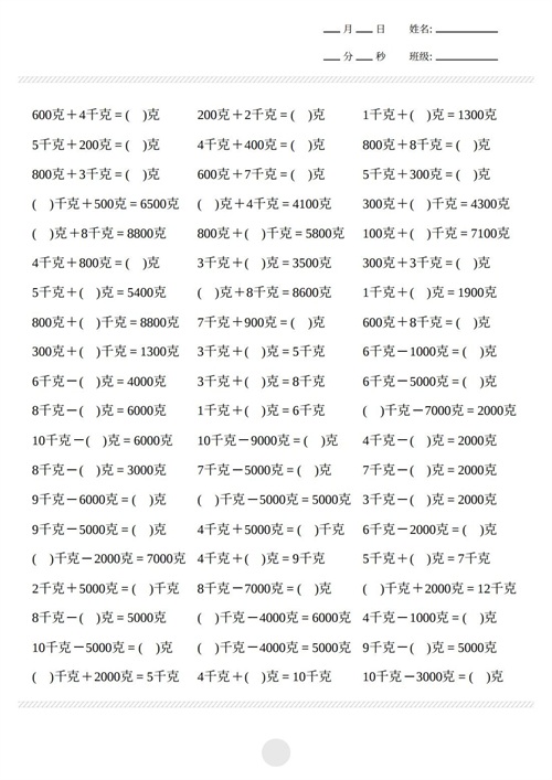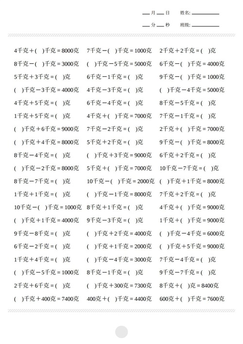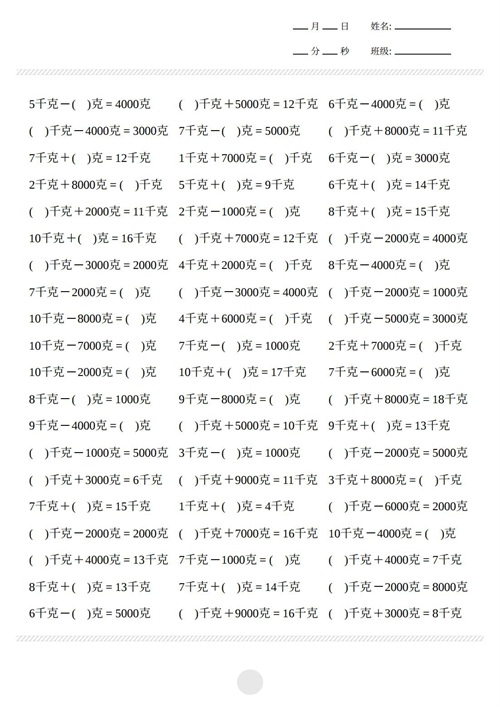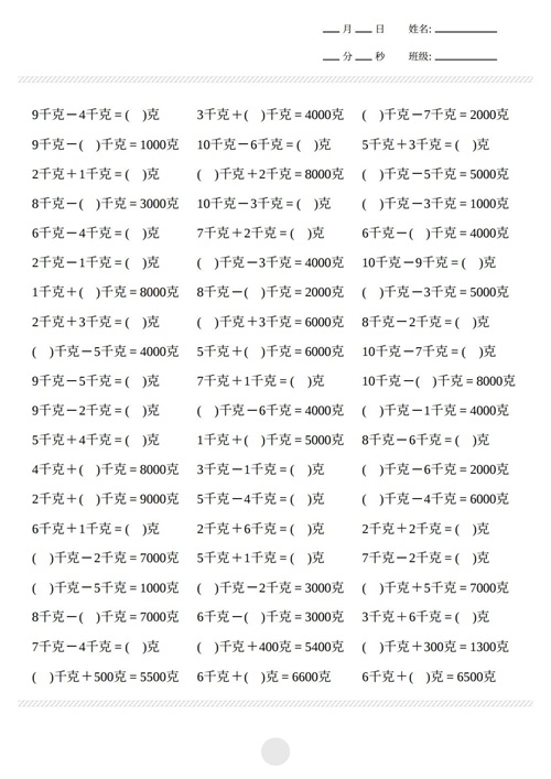 二年级数学克与千克之间的计算互换2000题,包含了最基础的课与千克之间的换算,能够做好这些计算题,就说明在学习克与千克这部分,计算能力相当好,最重要的是上面有日期,可以让孩子做限时训练,一天一页,非常锻炼孩子